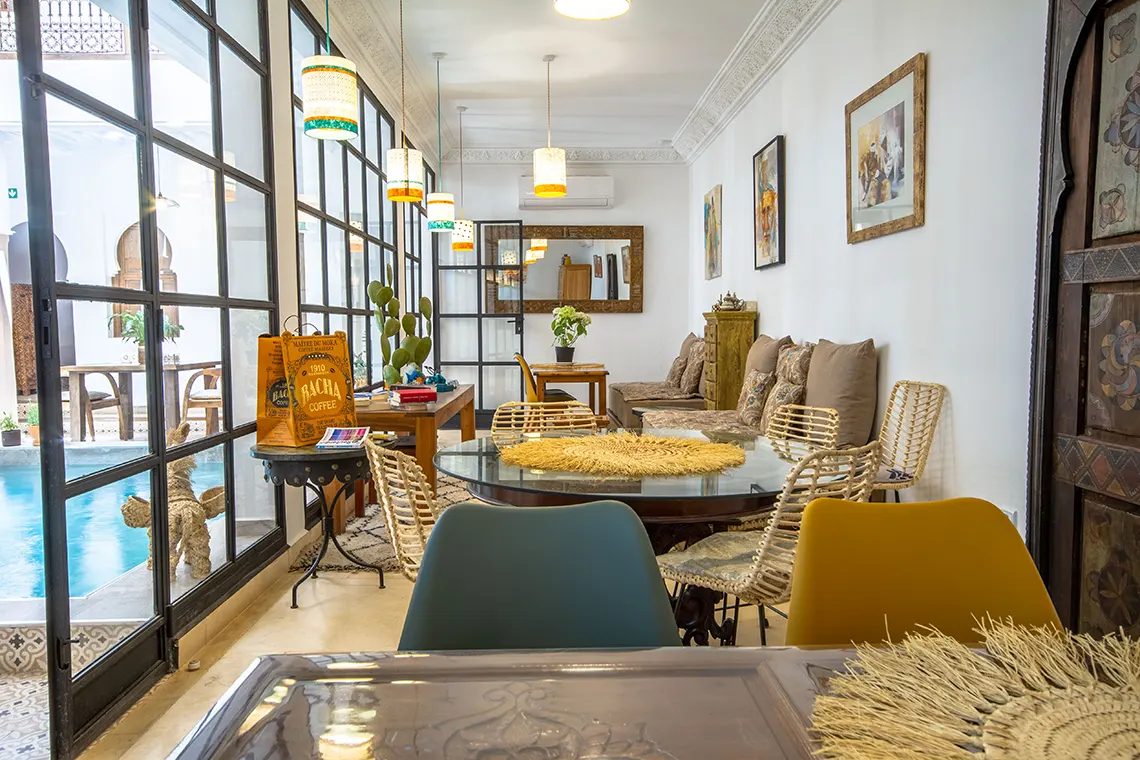 Le Riad Bab Aljana est idéalement situé au cœur de la Médina de Marrakech, à 5 minutes à pied de la place Jemaa El Fna, proche des souks animés ainsi que des principaux sites touristiques. Vous y vivrez un séjour charmant et authentique, au calme de l’une de ses six belles chambres, donnant sur un patio paisible agrémenté d’une piscine. Vous profiterez du toit-terrasse, équipé d’un solarium et d’un salon de détente. La table d’hôtes du riad vous invite à découvrir les saveurs généreuses de la gastronomie marocaine, avec des plats traditionnels confectionnés par notre excellente cuisinière à base de produits frais du marché. Notre équipe est disponible 24h/24 et 7j/7 pour répondre à vos besoins, et vous conseillera au mieux pour organiser vos transferts, excursions, visites et loisirs.