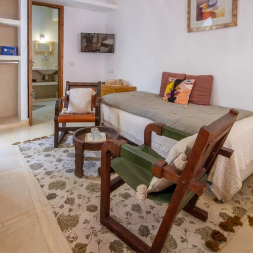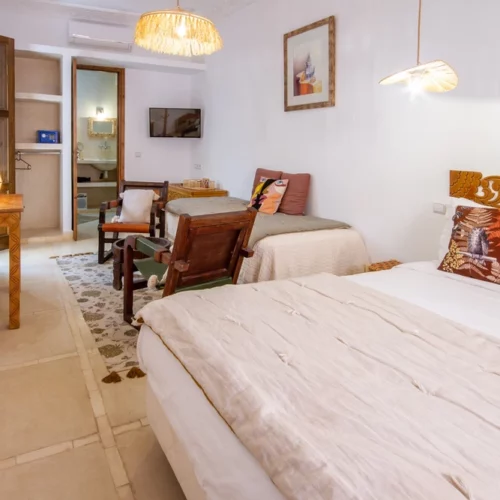 La chambre double deluxe, pouvant accueillir jusqu’à trois personnes, offre une superficie confortable de 25 m². Elle bénéficie d’une fenêtre donnant sur l’extérieur, avec vue sur le derb, et d’une seconde fenêtre ouvrant sur la coursive et le patio. Les murs blancs apportent de la clarté, tandis que les boiseries brun clair, y compris les doubles volets en bois des fenêtres et de la porte, renforcent le charme traditionnel de la pièce.