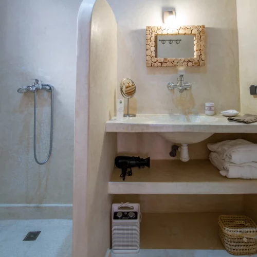 - Deux grandes étagères en tadelakt sous le lavabo (linge de toilette de marque, sèche-cheveux)
