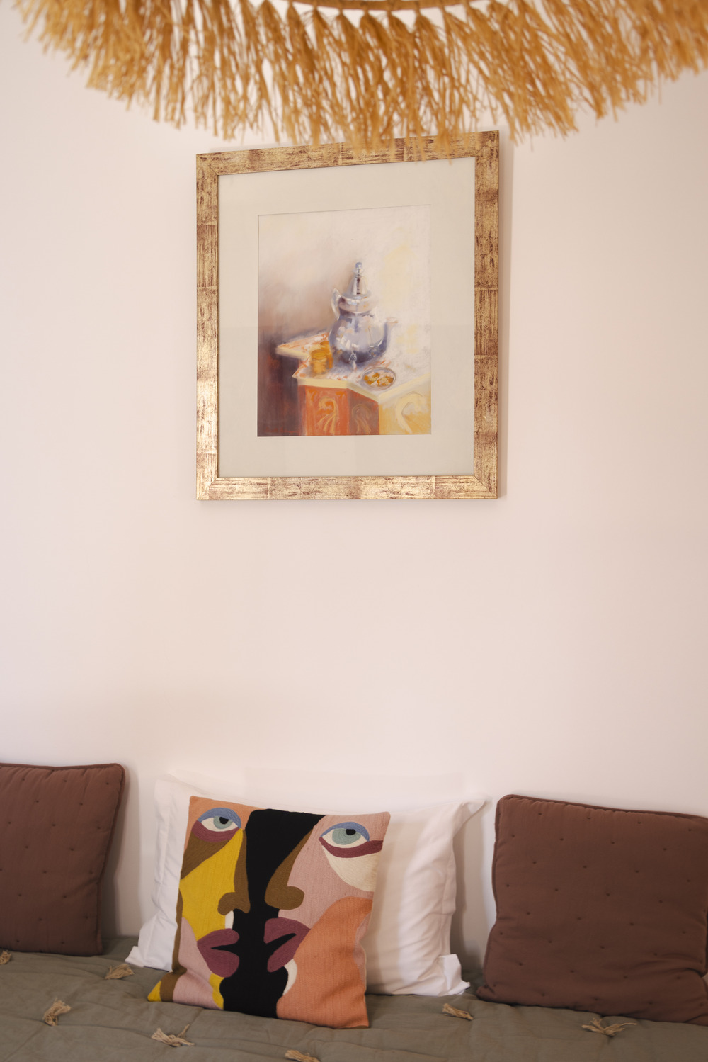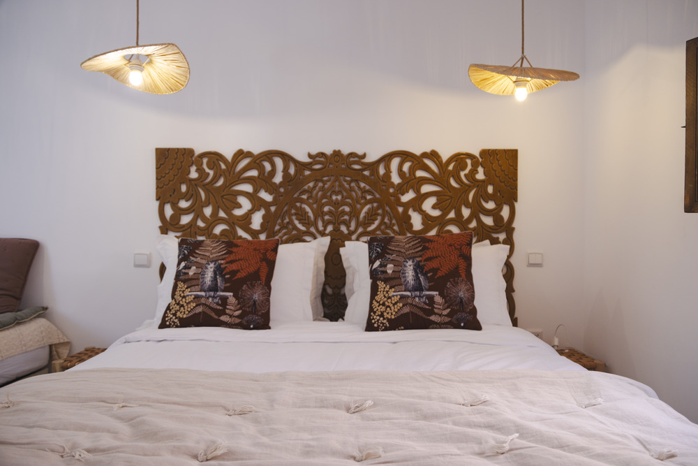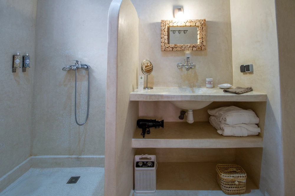La salle de bain privée est entièrement réalisée en tadelakt de couleur naturelle. Elle comprend une douche, un lavabo et des toilettes, alliant confort moderne et esthétique artisanale. Le sol est habillé de tadelakt et de briquettes, créant une atmosphère chaleureuse et authentique. Des abat-jours en paille tressée diffusent une lumière douce et tamisée, idéale pour la détente. La chambre se distingue par une décoration dans des tons subtils de vieux rose et de vert bronze, qui lui confèrent une ambiance élégante et reposante.