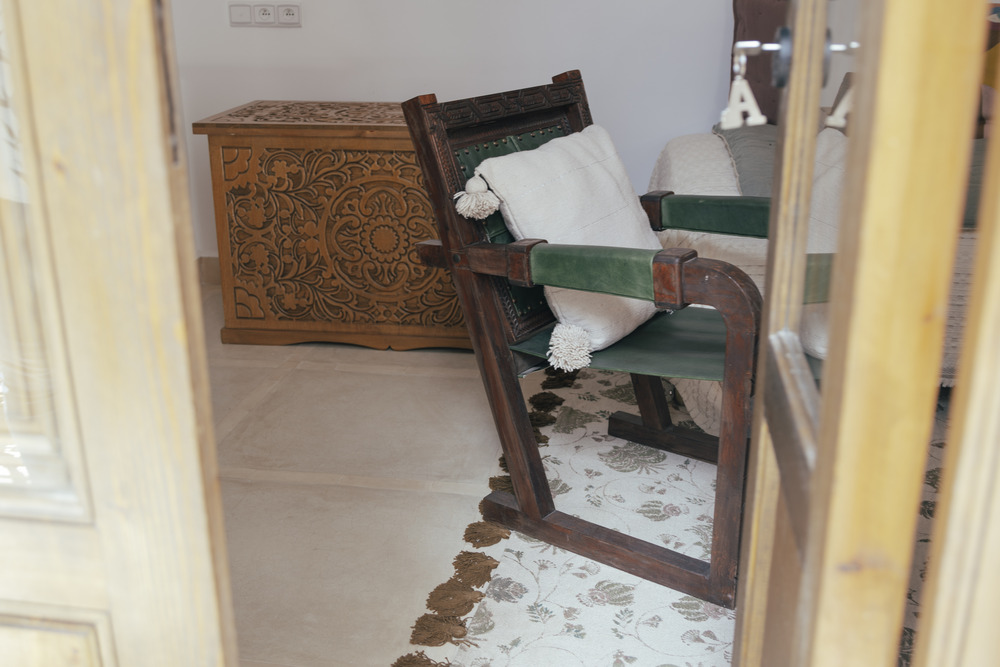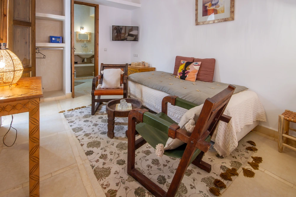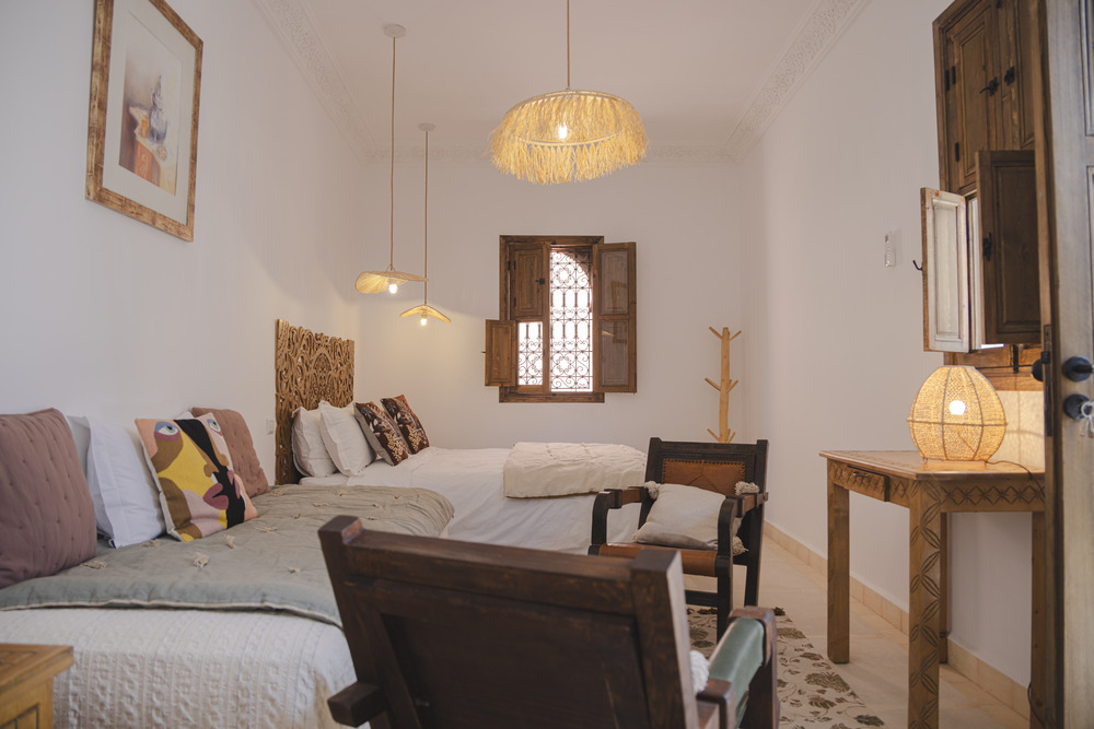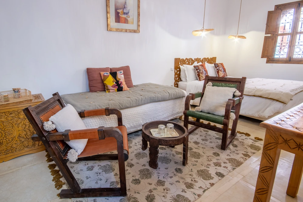 La chambre double deluxe, pouvant accueillir jusqu’à trois personnes, offre une superficie confortable de 25 m². Elle bénéficie d’une fenêtre donnant sur l’extérieur, avec vue sur le derb, et d’une seconde fenêtre ouvrant sur la coursive et le patio. Les murs blancs apportent de la clarté, tandis que les boiseries brun clair, y compris les doubles volets en bois des fenêtres et de la porte, renforcent le charme traditionnel de la pièce.