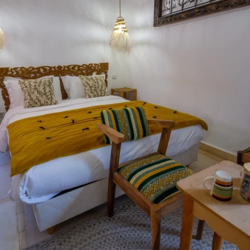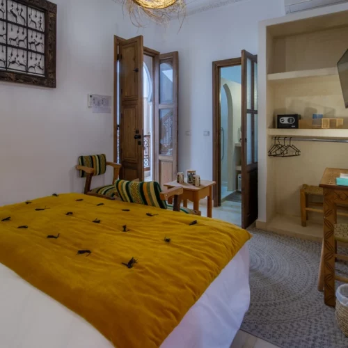La chambre double standard offre un espace de 18 m², parfait pour un séjour confortable à deux. Une fenêtre donne sur un petit derb paisible, tandis que la porte s’ouvre sur la coursive et le patio du riad, baignant la pièce de lumière naturelle.