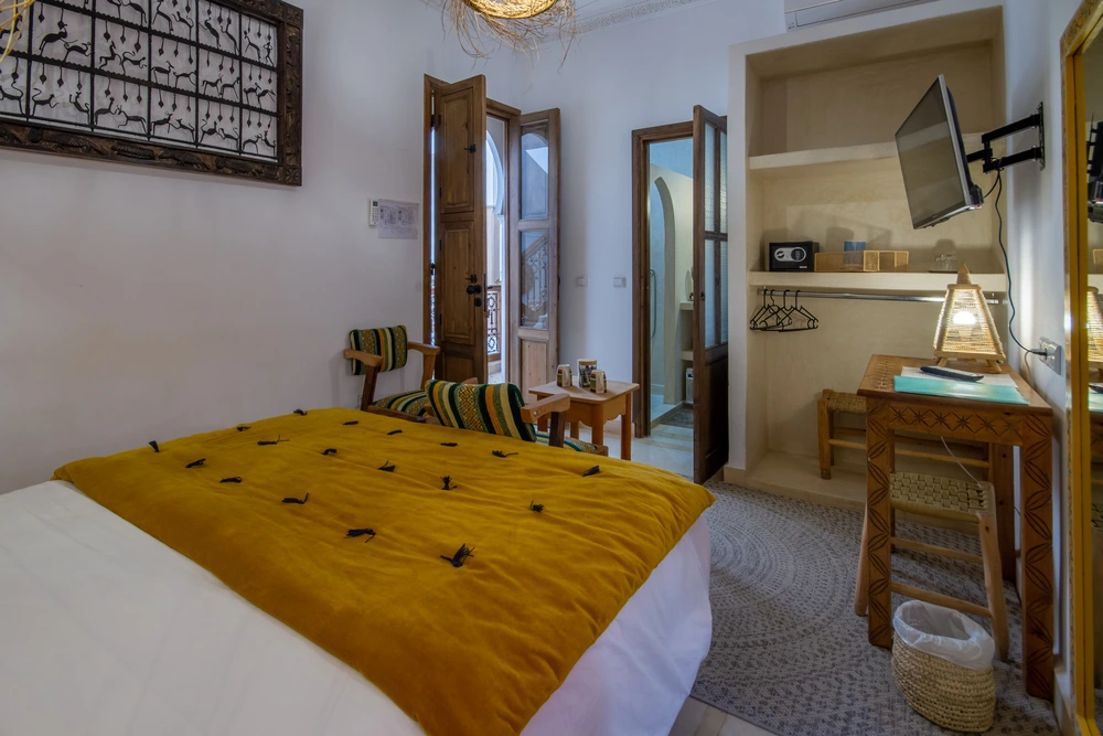 La chambre double standard offre un espace de 18 m², parfait pour un séjour confortable à deux. Une fenêtre donne sur un petit derb paisible, tandis que la porte s’ouvre sur la coursive et le patio du riad, baignant la pièce de lumière naturelle.