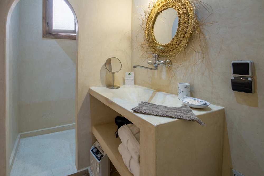 Les murs sont d’un blanc éclatant, réchauffés par des boiseries brun clair. Les doubles volets en bois des fenêtres et de la porte ajoutent une touche traditionnelle pleine de charme. La salle de bain privée, réalisée en tadelakt couleur naturelle, comprend une douche, un lavabo et des toilettes. Le sol, mêlant tadelakt et briquettes, prolonge l’authenticité de l’ensemble.