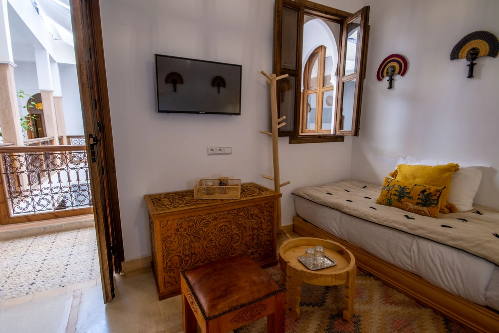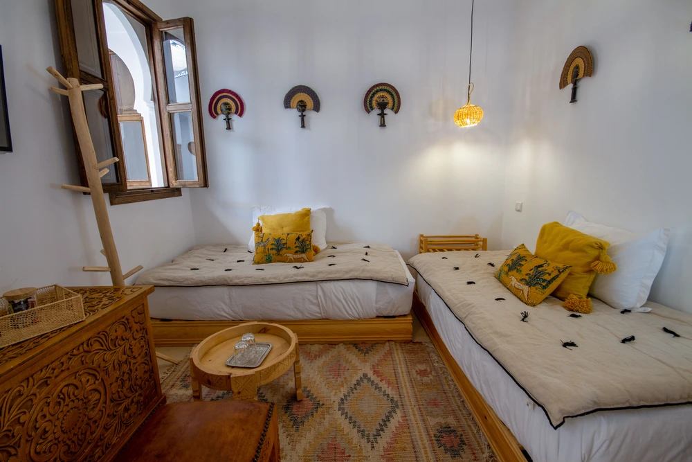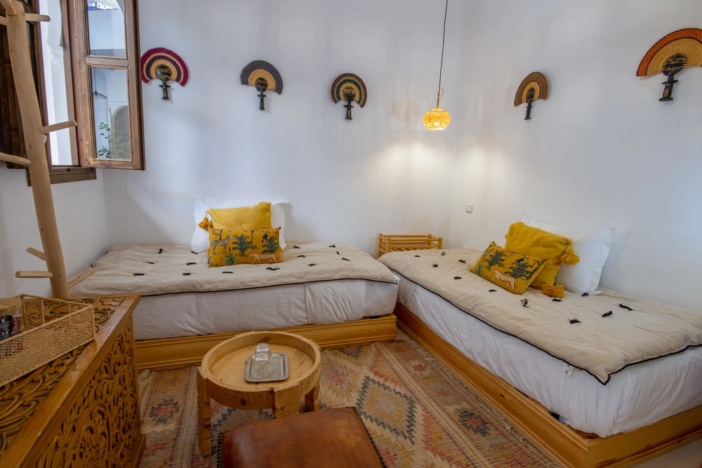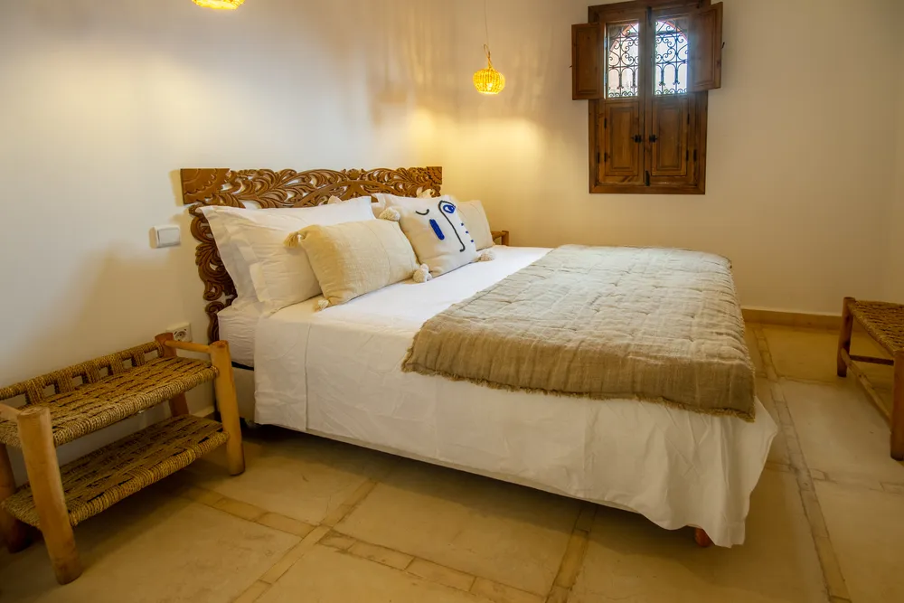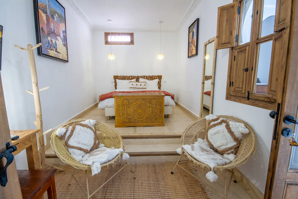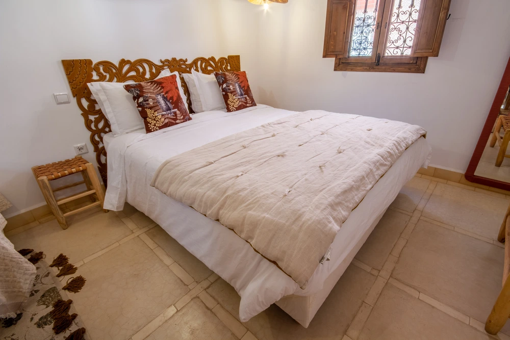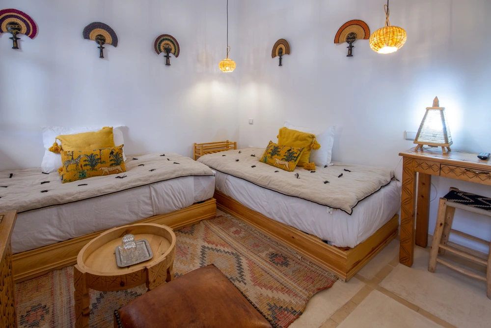La décoration mêle artisanat marocain et africain, dans des tons chauds qui invitent au voyage et à la détente.