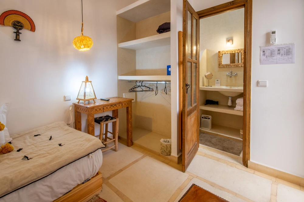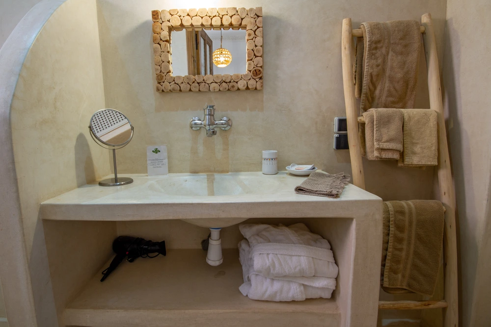 La salle de bain privée est réalisée en tadelakt de couleur naturelle. Elle est équipée d’une douche, d’un lavabo et de toilettes, alliant simplicité et charme traditionnel.
