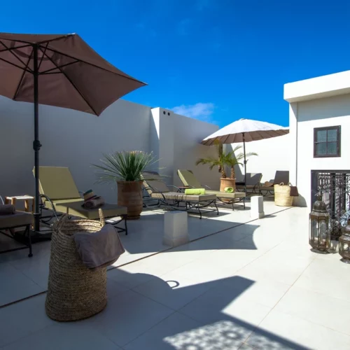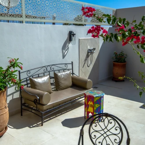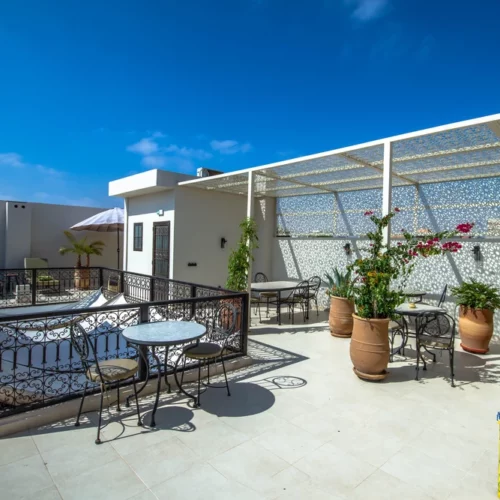 Au-dessus, la terrasse ouvre sur le ciel bleu et les toits de la médina. Le petit-déjeuner complet marocain y est servi aux beaux jours dès le lever du soleil. Pains ronds, confitures maison, jus frais, viennoiseries… un régal copieux et généreux. Le soir, la lumière dorée du couchant transforme la ville. On s’y retrouve pour un soft, un moment de calme, une conversation ou pour profiter de la douceur d’une fin d’après-midi.