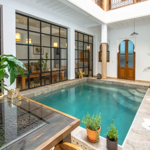 Notre riad entièrement rénové, mêlant charme marocain et confort moderne, vous ouvre ses portes en bois. Avec ses six chambres confortables, son patio central, sa piscine rafraichissante et sa terrasse baignée de soleil, notre maison d’hôtes est le point de départ idéal pour découvrir Marrakech à pied, sans ne rien manquer. L’accueil y est chaleureux, les conseils toujours avisés, et les saveurs de la cuisine maison éveillent les sens.