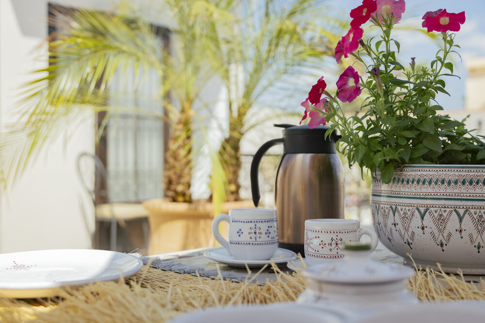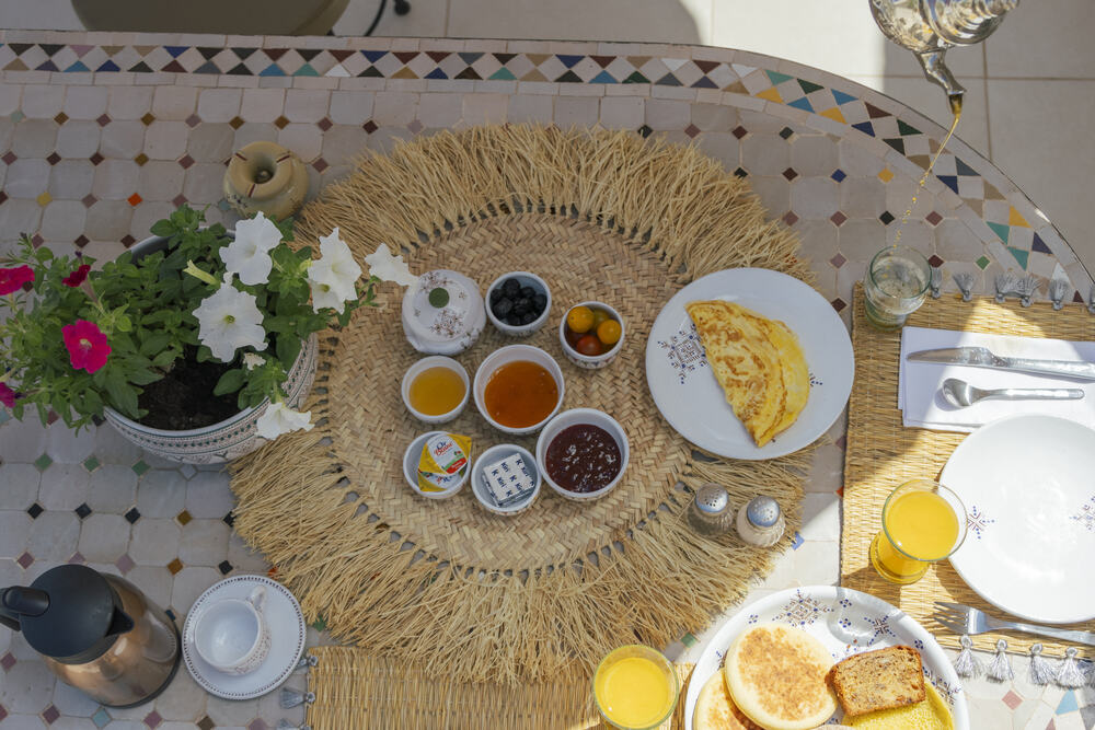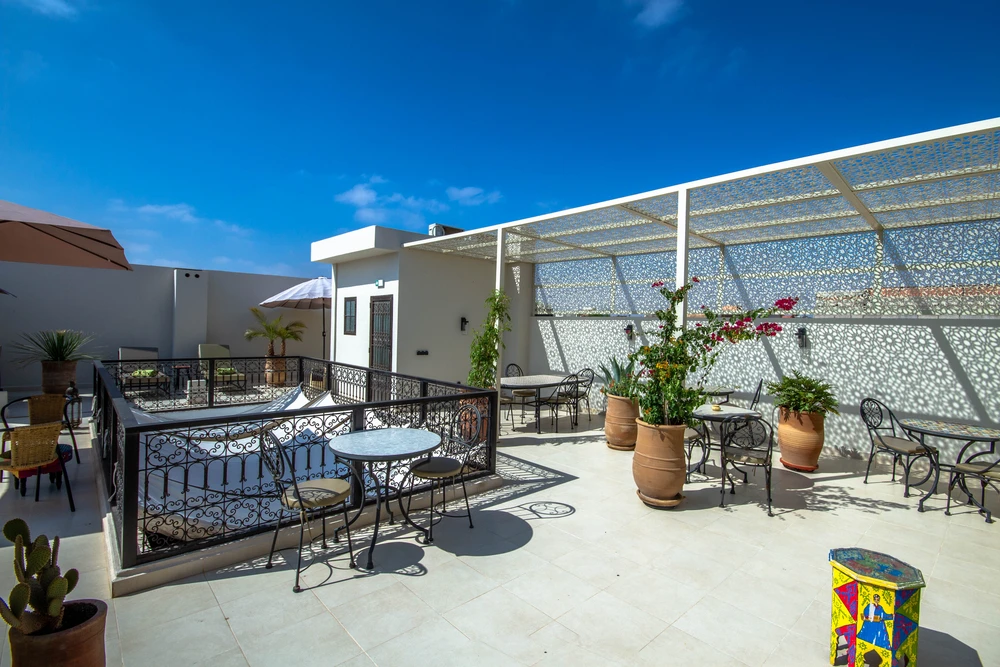 Au-dessus, la terrasse ouvre sur le ciel bleu et les toits de la médina. Le petit-déjeuner complet marocain y est servi aux beaux jours dès le lever du soleil. Pains ronds, confitures maison, jus frais, viennoiseries… un régal copieux et généreux. Le soir, la lumière dorée du couchant transforme la ville. On s’y retrouve pour un soft, un moment de calme, une conversation ou pour profiter de la douceur d’une fin d’après-midi.