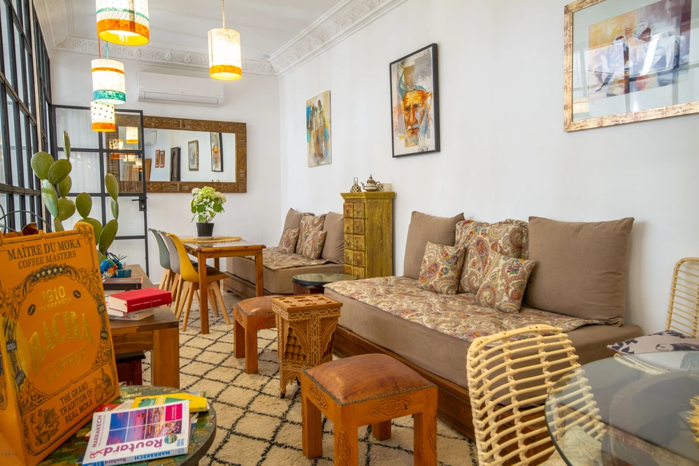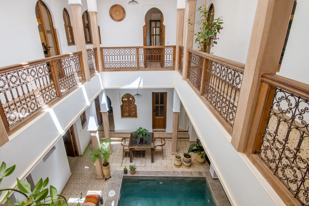 Notre riad entièrement rénové, mêlant charme marocain et confort moderne, vous ouvre ses portes en bois. Avec ses six chambres confortables, son patio central, sa piscine rafraichissante et sa terrasse baignée de soleil, notre maison d’hôtes est le point de départ idéal pour découvrir Marrakech à pied, sans ne rien manquer. L’accueil y est chaleureux, les conseils toujours avisés, et les saveurs de la cuisine maison éveillent les sens.