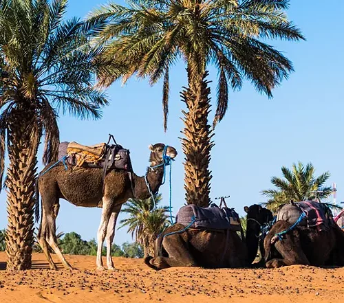 Au lever du soleil, la lumière dorée sublime les paysages désertiques, les oasis et les montagnes de l’Atlas en arrière-plan.