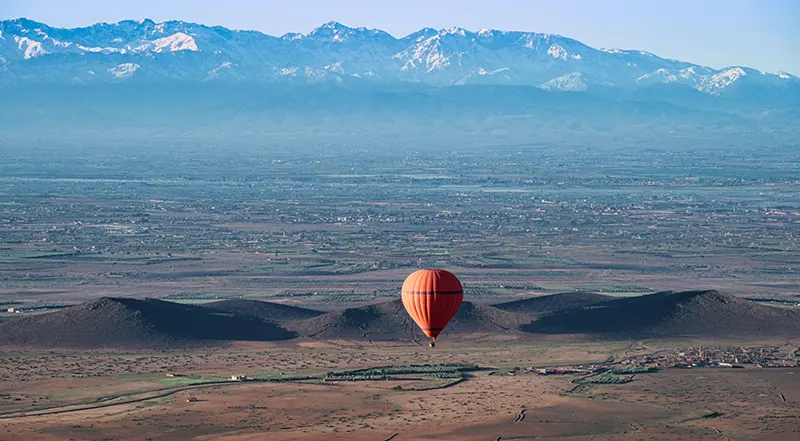 Dès les premières lueurs du jour, le ciel de Marrakech s’embrase de teintes dorées. C’est le moment parfait pour prendre de la hauteur et découvrir Marrakech et ses environs sous un angle totalement différent, loin de l’agitation des souks et de la médina.